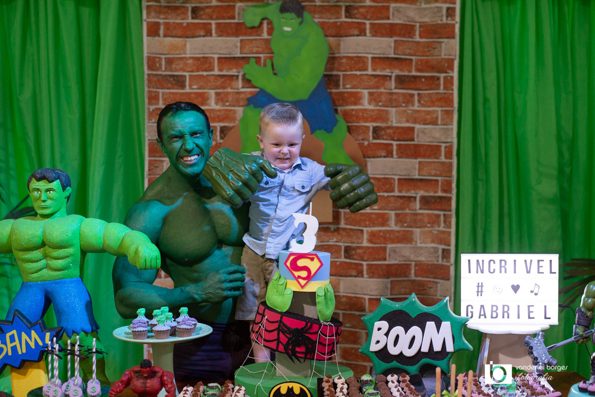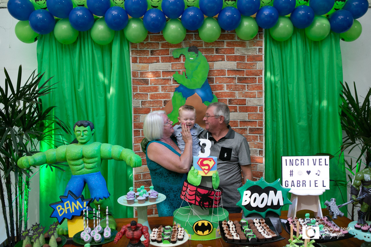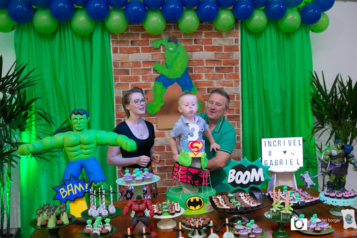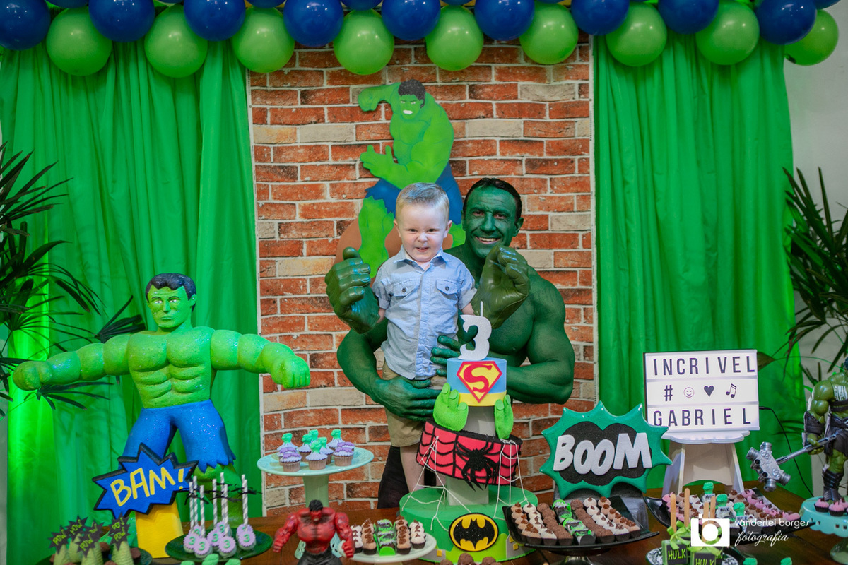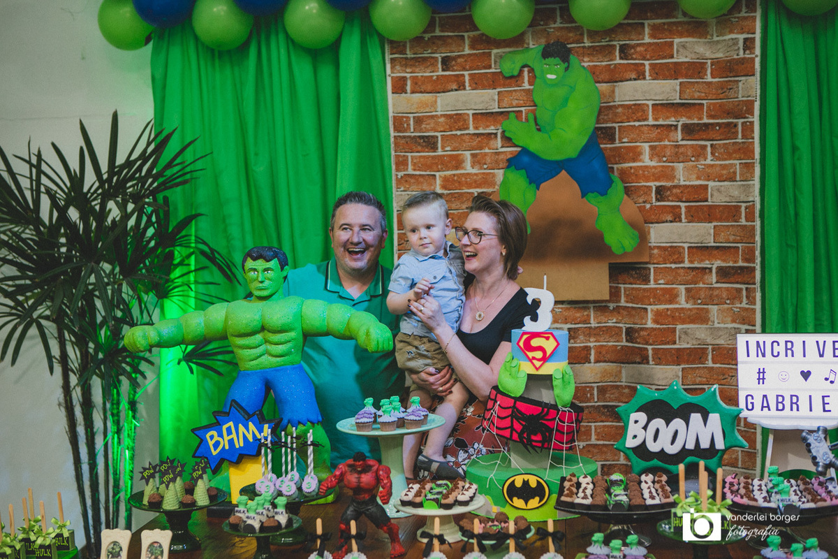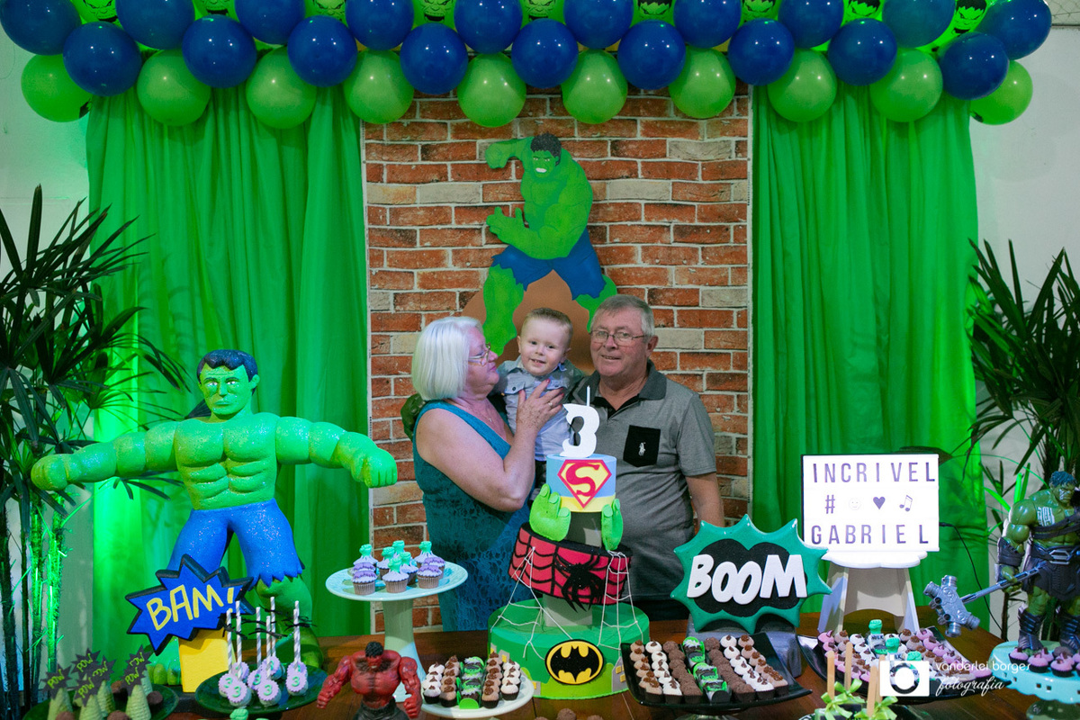 Foi o que aconteceu como Gabriel que no dia 27 de fevereiro comemorou o seus três aninhos de vida e sua decoração foi com o tema do incrível Hulk.