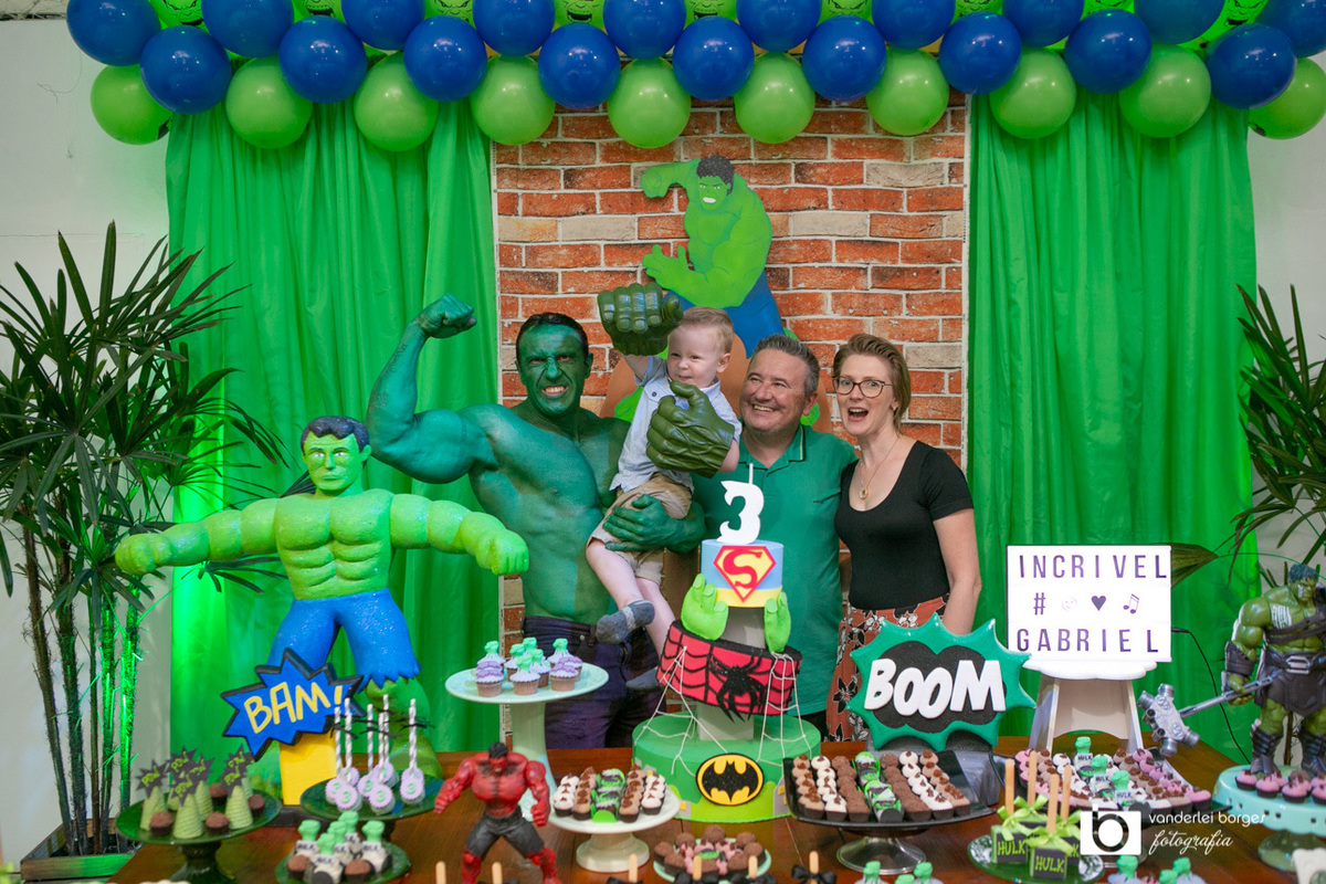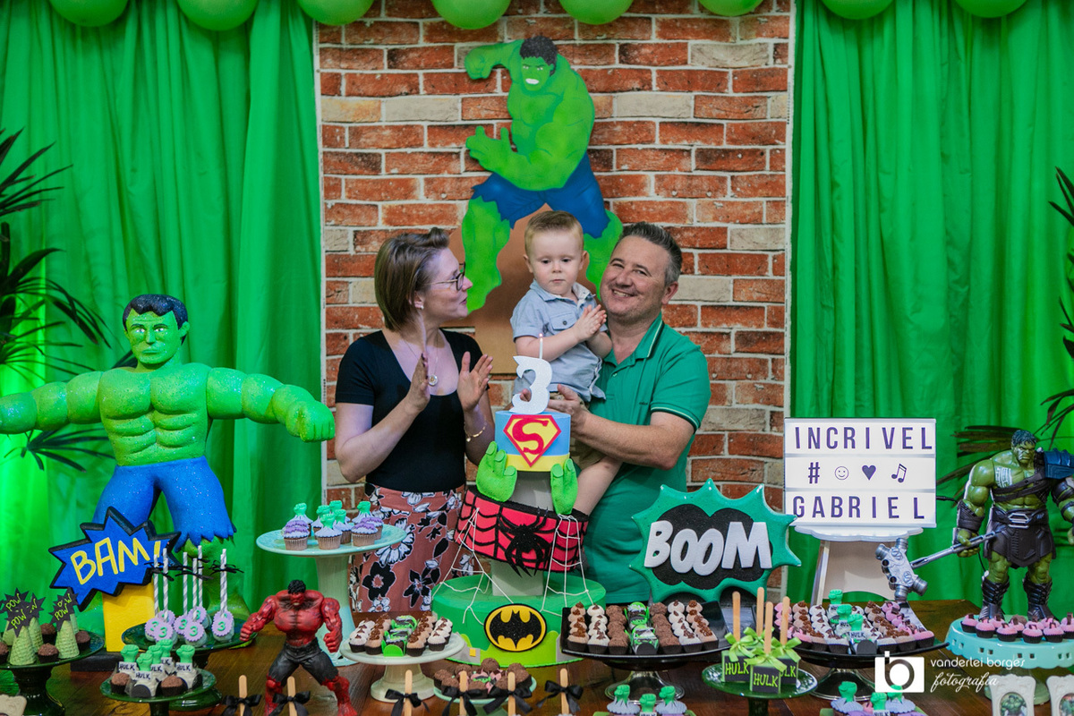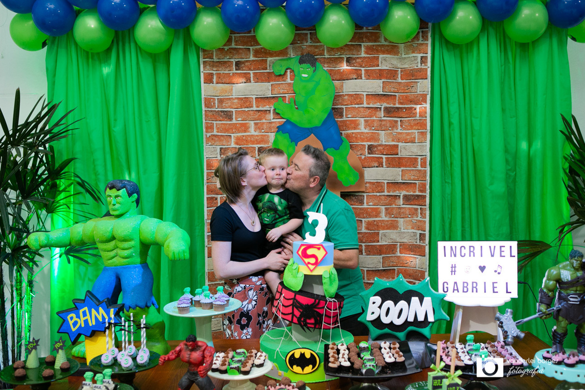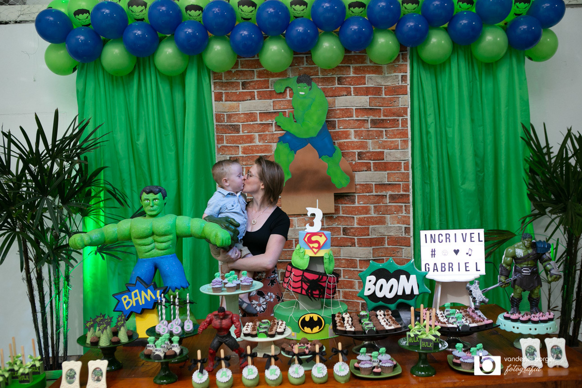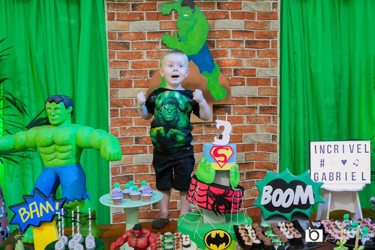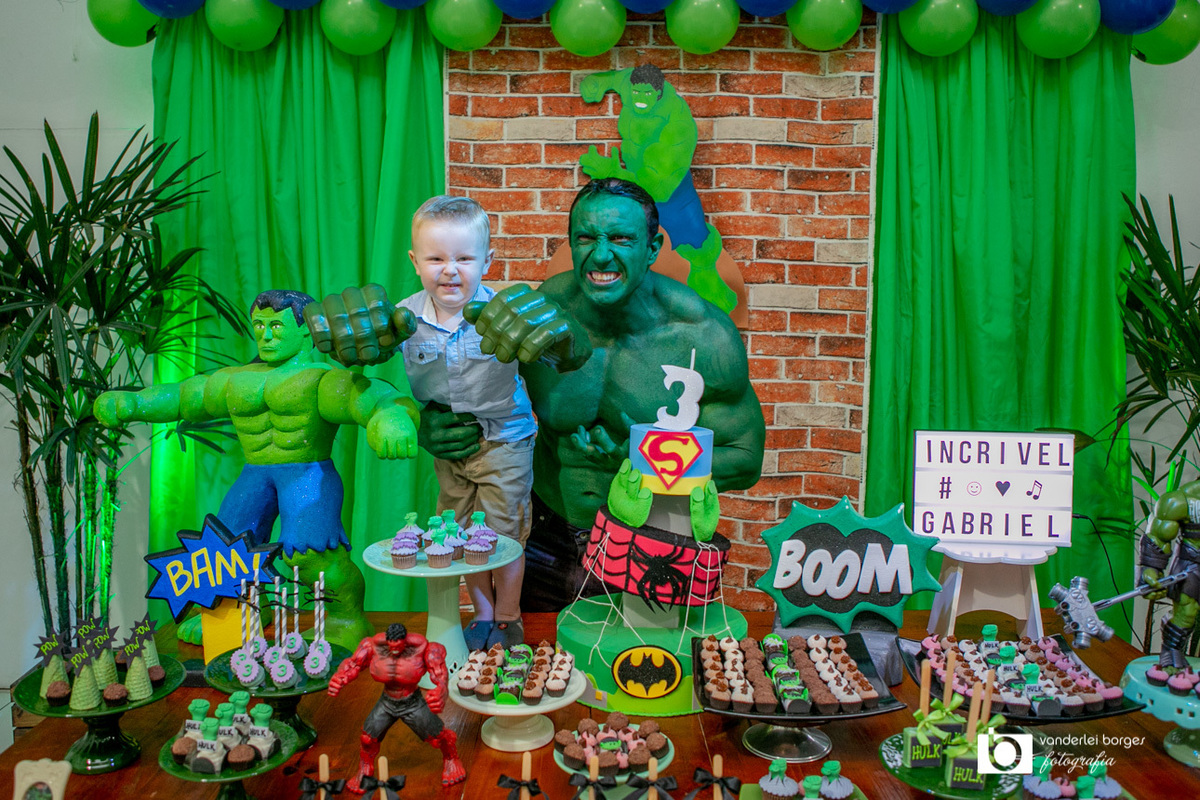 Foi o que aconteceu como Gabriel que no dia 27 de fevereiro comemorou o seus três aninhos de vida e sua decoração foi com o tema do incrível Hulk.