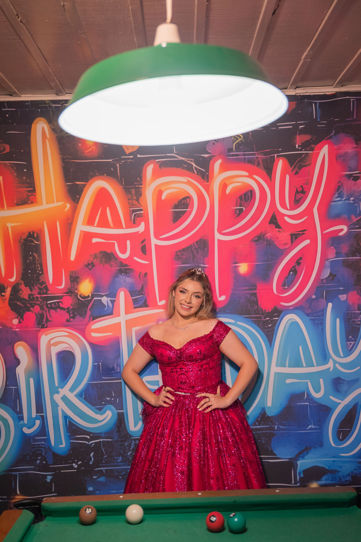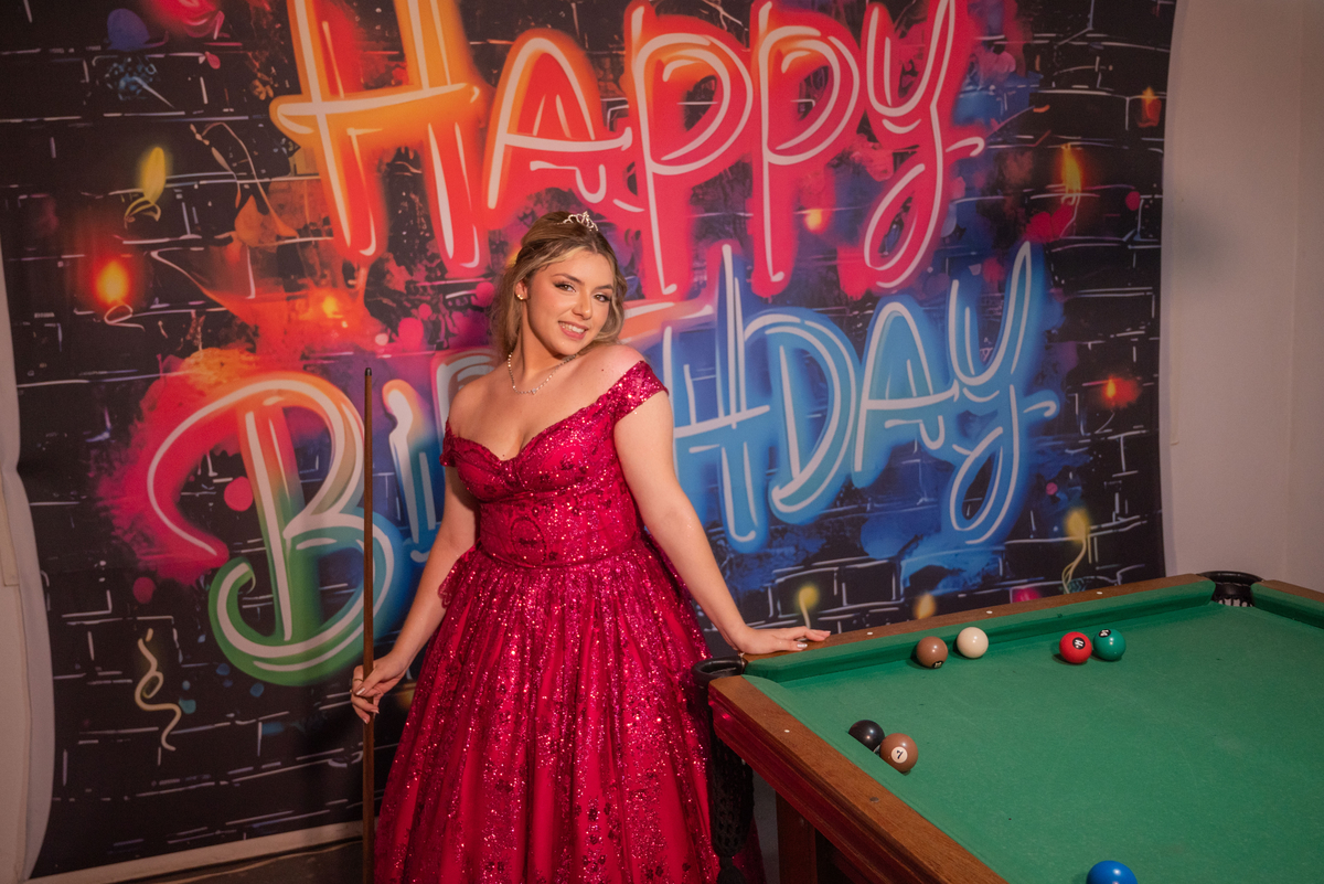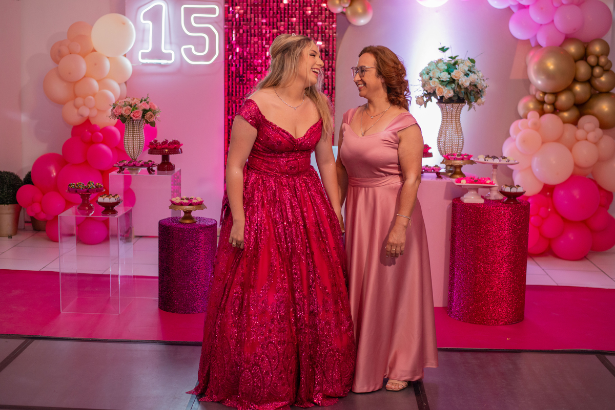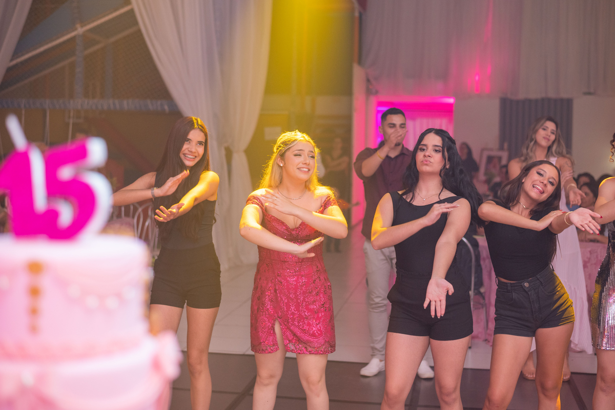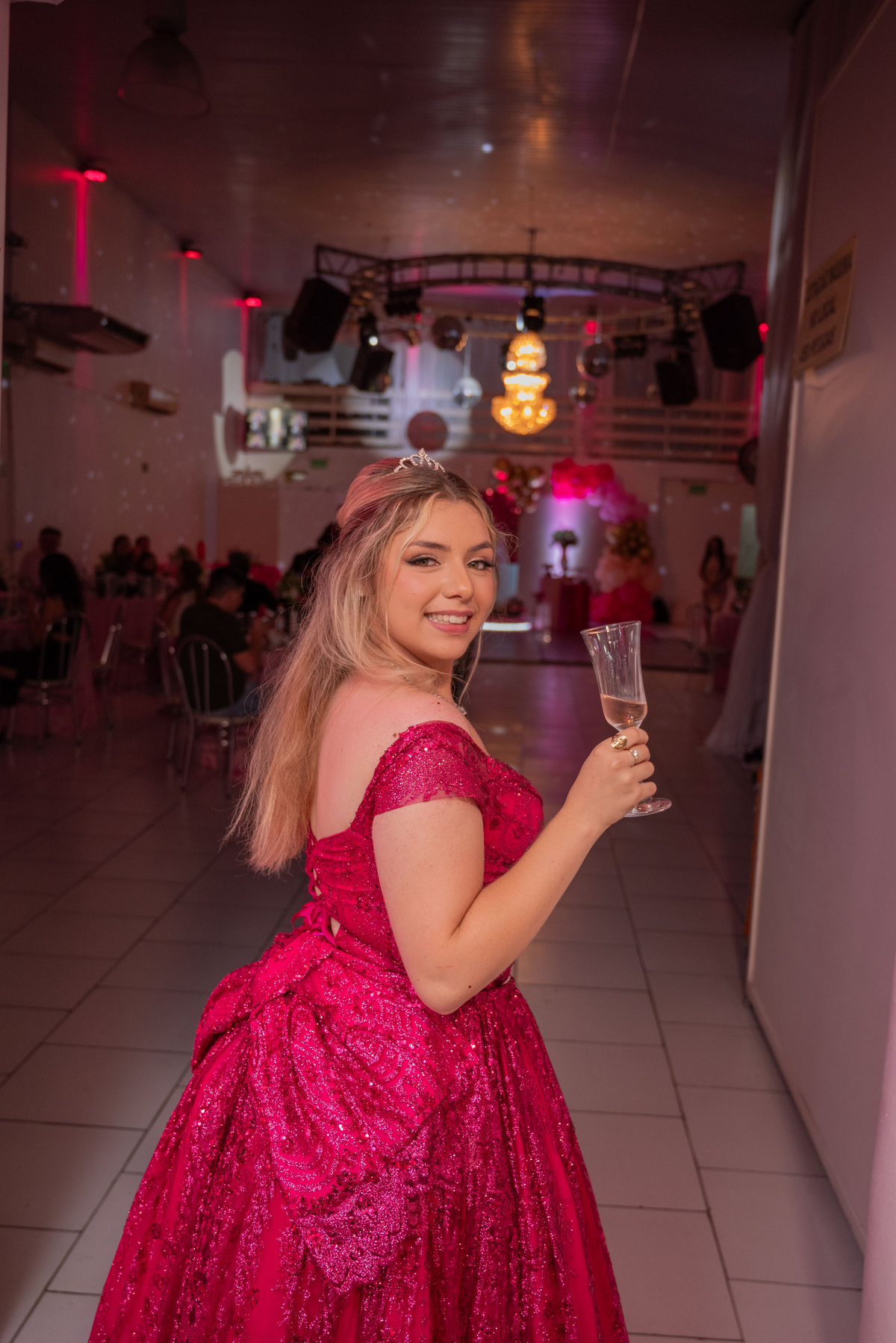 As luzes brilhavam intensamente, O salão estava decorado com flores delicadas e balões coloridos, criando um clima mágico e especial. A música estava contagiante, e todos se divertiam na pista de dança, celebrando a alegria desse momento tão especial na vida de Emanuelle.